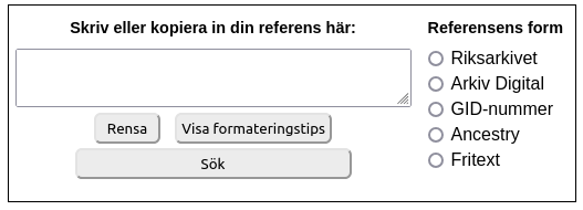 När du fyllt i referensen lämnar du fältet med <Tab> (inte med <Enter>) eller klickar på Sök. Dispos försöker då tolka det inskrivna, och om formatet känns igen så markeras det i kolumnen med ’radioknappar’ till höger. Du behöver alltså inte själv markera.